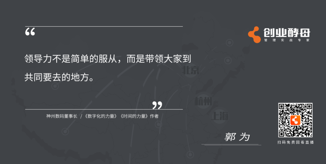 如果永远是Me too,别人开饭馆,你也开饭馆,别人卖软件,你也卖软件,没有走在时代的前面,提前去布局,那就没有办法来领导这个组织,也不可能具有领导力。